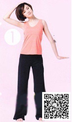 1、 双脚打开与肩同宽,右手从侧面把头向右侧压,同时左手手腕用力向下压,感觉左侧的线条得到充分拉伸,还原后换左手再做一次。